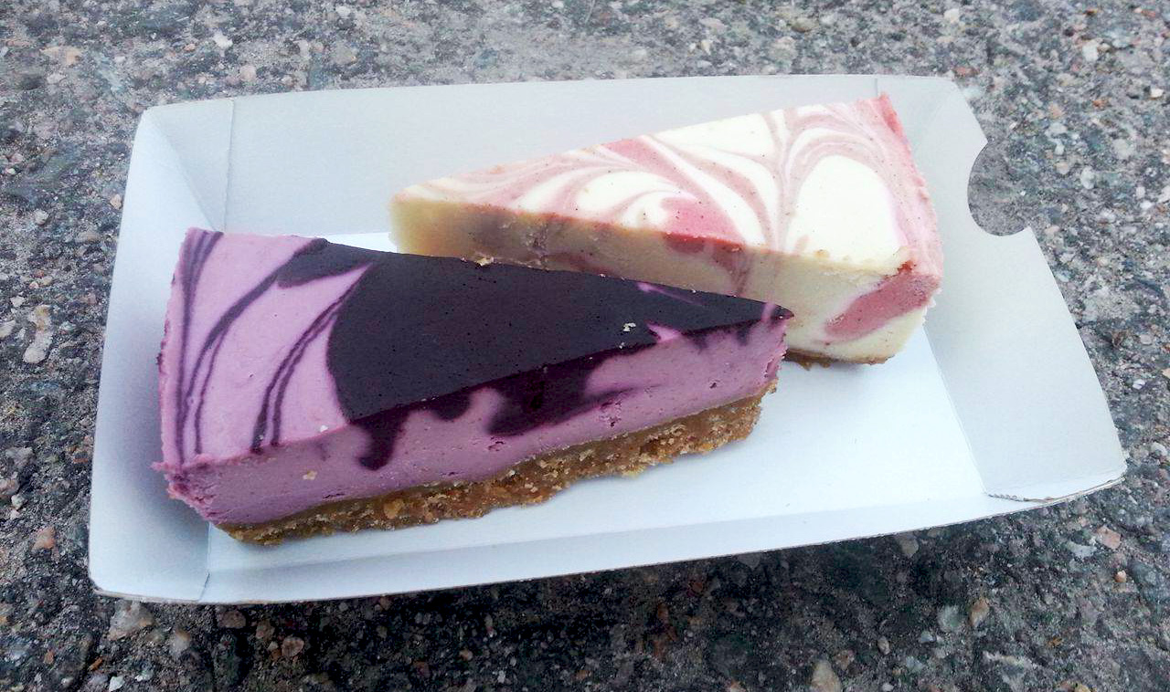 Olen kuullut paljon kehuja Rawan raakakakuista, mutta maistoin niitä ensimmäistä kertaa vasta Flow’ssa. Mauiksi valikoituivat lakritsa-vadelma ja valkosuklaa-mansikka. Kakkujen tarkka resepti on salaisuus, mutta pohjaan oli käytetty oletettavasti ainakin cashew-pähkinää ja taatelia. Pohjan ja täytteen suhde oli Rawan kakuissa kohdillaan, sillä koostumukseltaan jämäkkää mutta suussasulavaa pohjaakin oli mukavan paksulti.