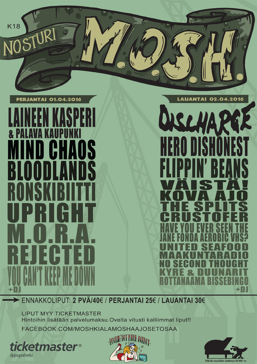 Nosturissa ja sen alakerran Elmun baarissa soittaa 1.-2.4. lähes kaksikymmentä bändiä. M.O.S.H.in musiikkikattaus on melkoinen sillisalaatti; siihen mahtuu popimpaa sekä raaempaa punkrockia, hardcorea, pari rap-edustajaa sekä myös esimerkiksi oma suosikkini, garagebändi The Splits. Harvakseltaan keikkaileva punkrock-kokoonpano Kyre & Duunarit heittää kyseisissä bileissä kevään ainoan keikkansa, minkä lisäksi tärppinä mainittakoon esimerkiksi vanhaa brittiheviä ja kaljastoneria rokkitatsilla soittava United SeaFood.